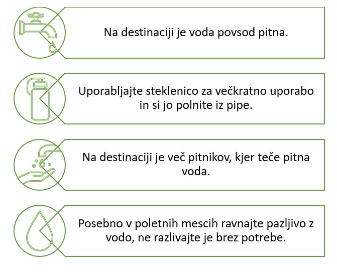 Se pa na destinaciji vse pogosteje, predvsem pa v poletnih mesecih, ko ni padavin, soočamo s pomanjkanjem pitne vode. Naš rižanski vir ne zmore zadovoljiti vseh potreb. S skupnimi močmi lahko vsaj malo pripomoremo k varovanju naše vode. Zato bodimo pri njeni uporabi pazljivi, ne razlivajmo je brez potrebe.