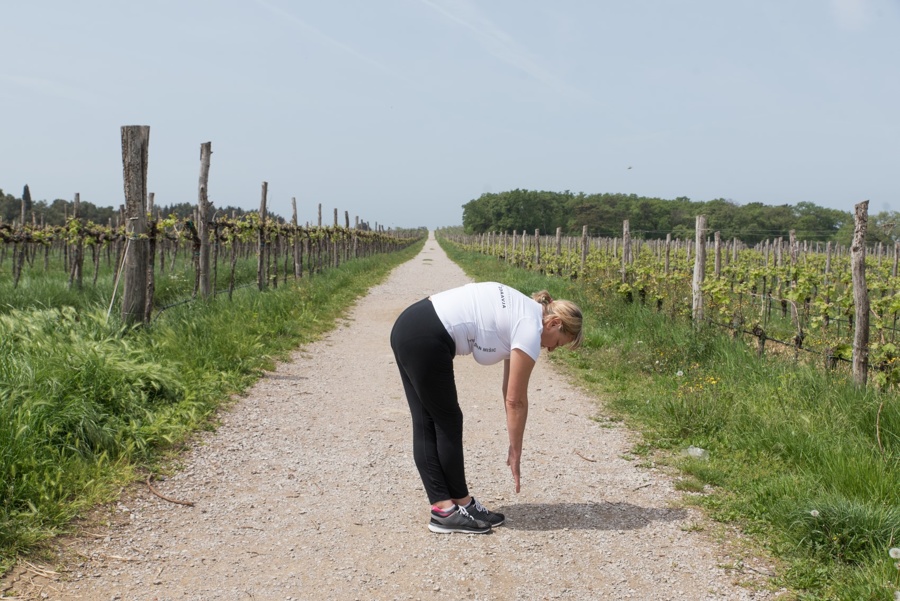 Stoje se najprej dvignemo na prste, nato se počasi pričnemo spuščati in preko začetnega položaja preidemo na pete. Vajo izvajamo dvakrat ali trikrat z 10 - 12 ponovitvami.