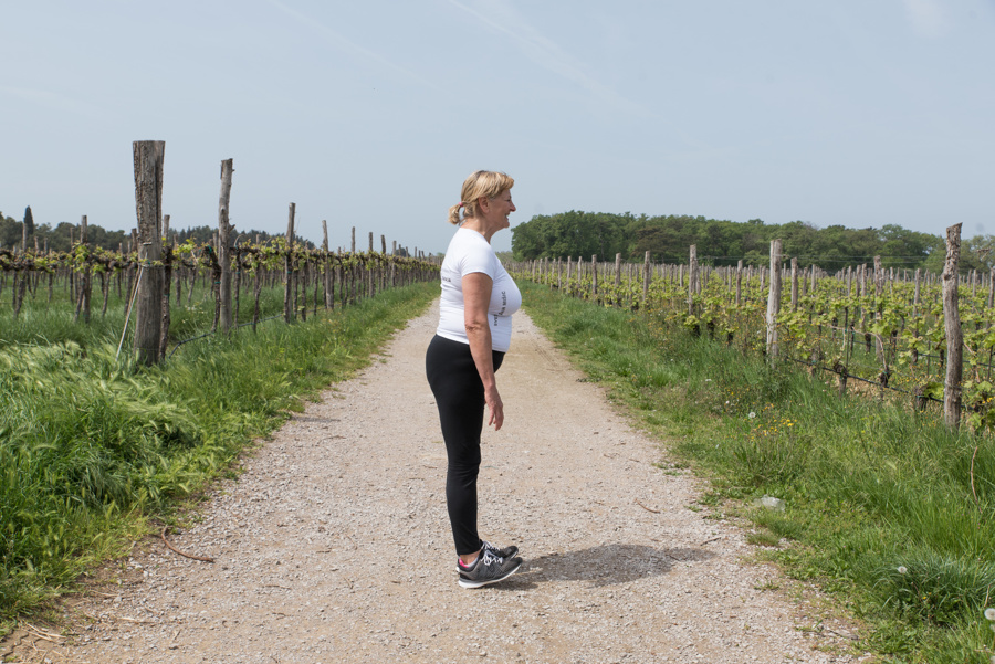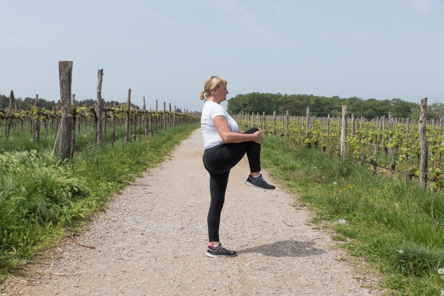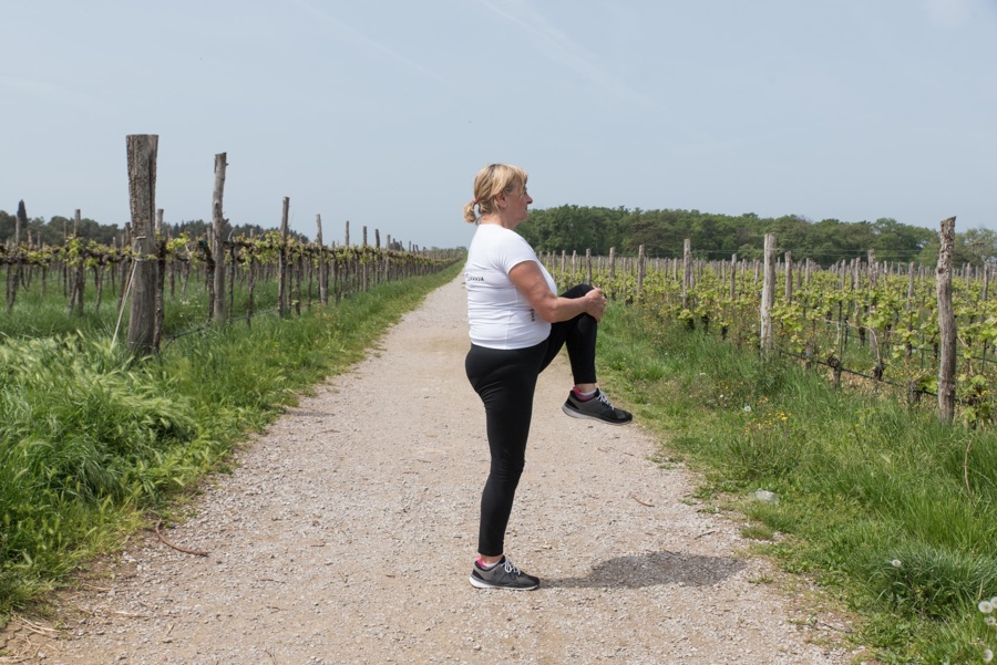 Stoje izmenično upogibamo kolena tako, da pete, kolikor lahko, približamo zadnjici. Vajo izvajamo v dveh ali treh serijah po 30 sekund.