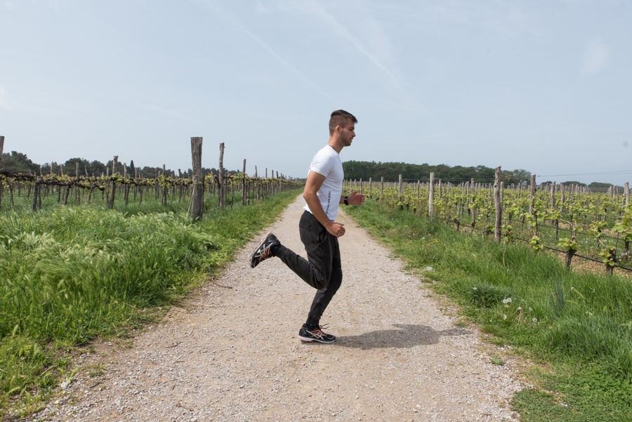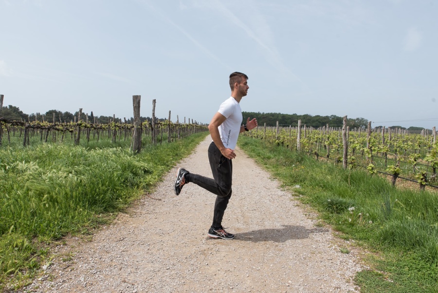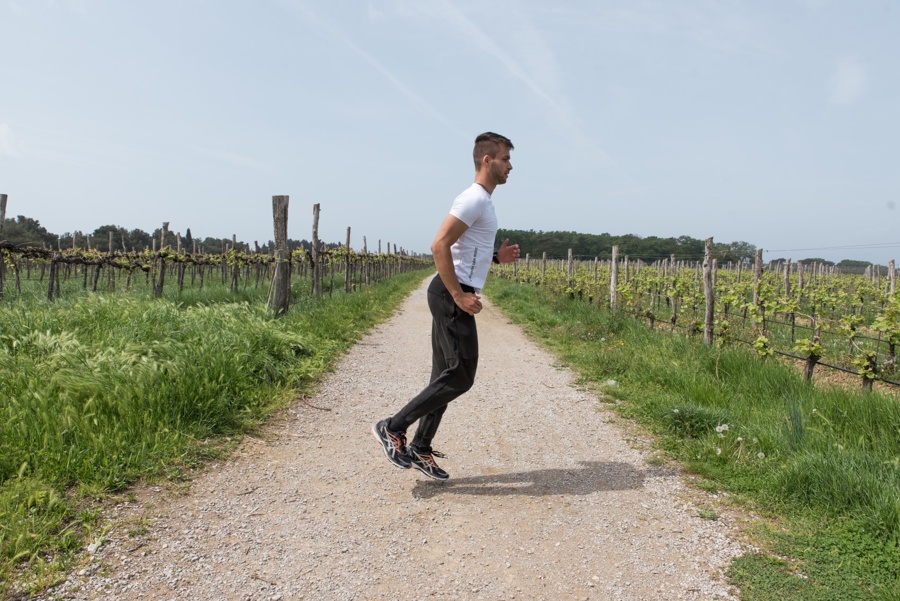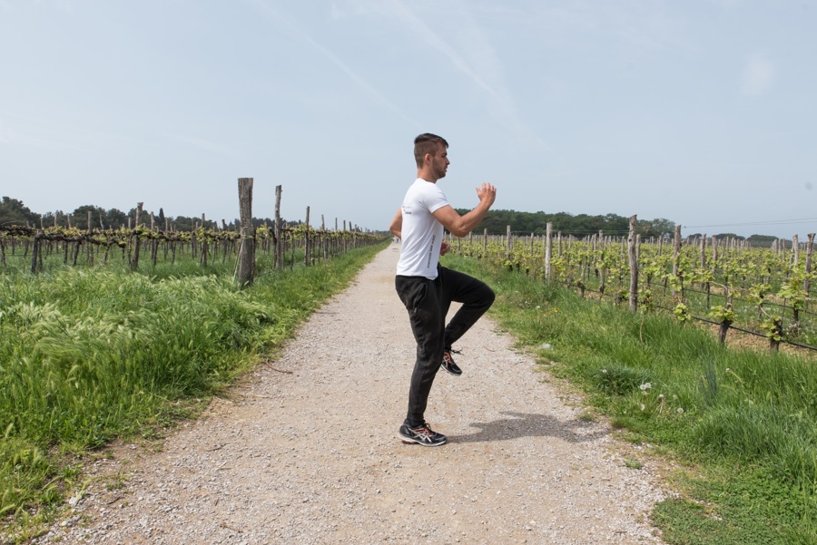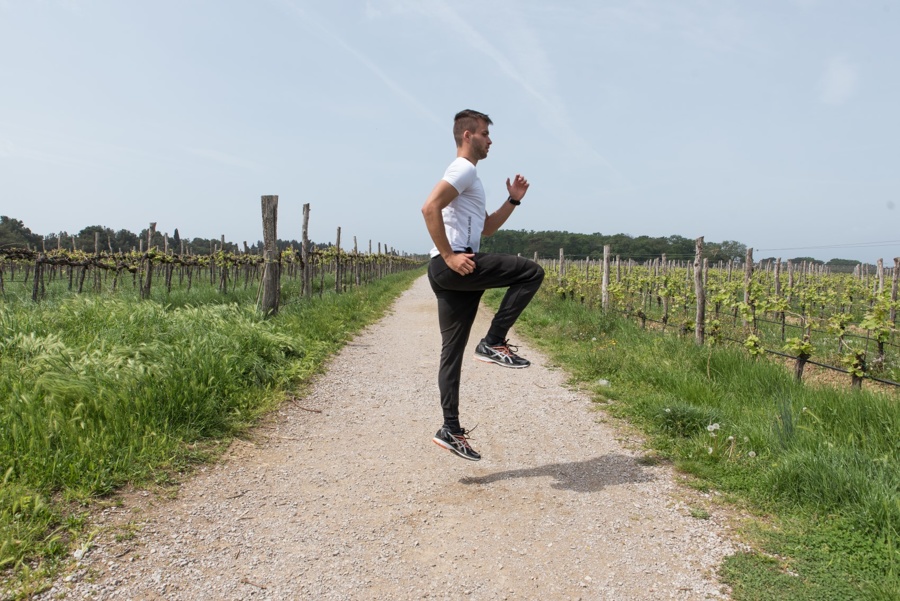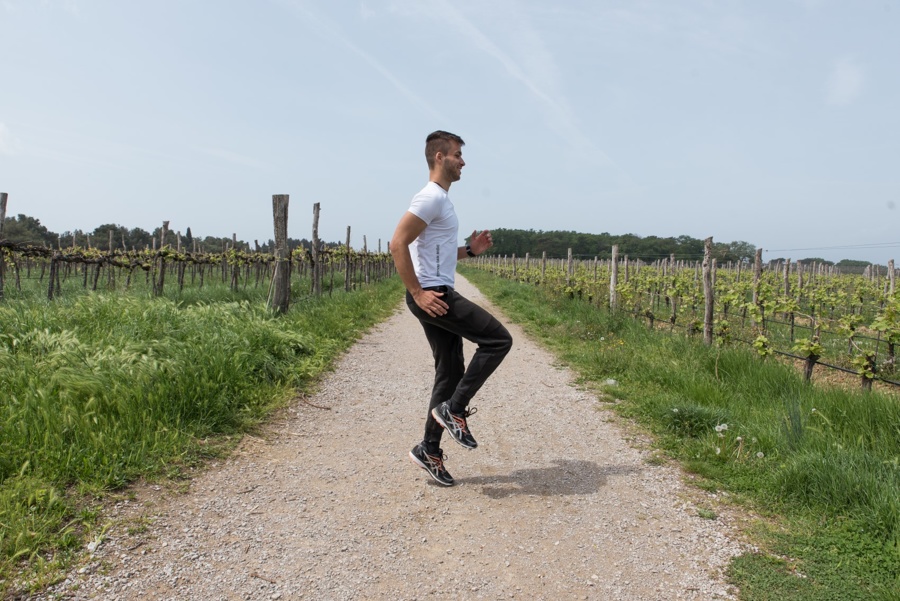 Stoje izmenično visoko zamahujemo s koleni (hopsamo). Vajo izvajamo v dveh ali treh serijah po 30 sekund.