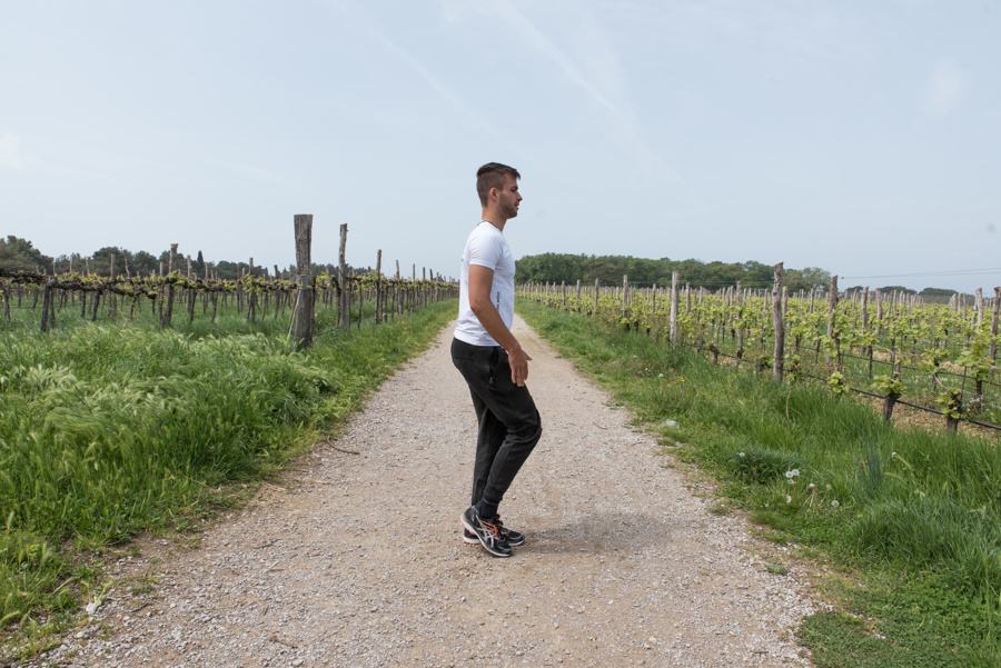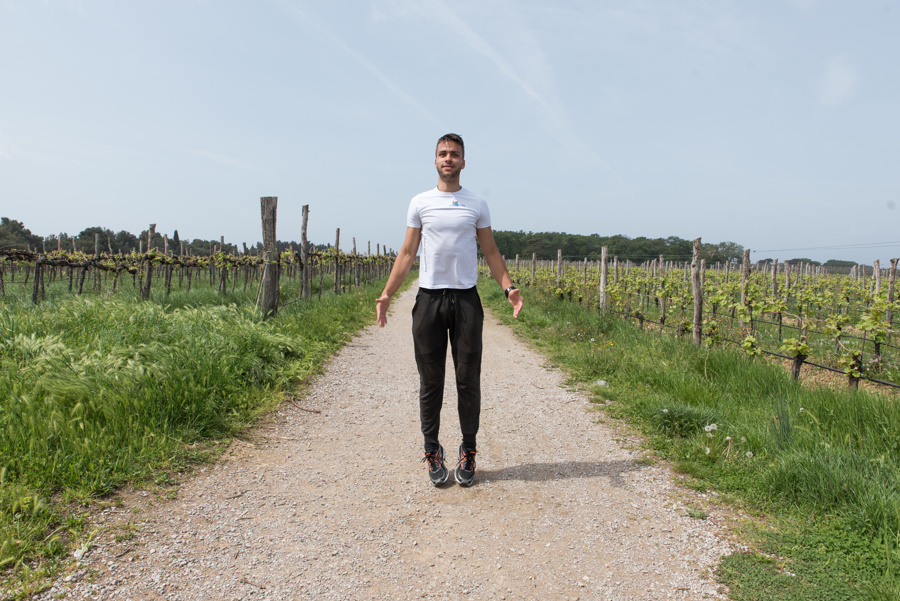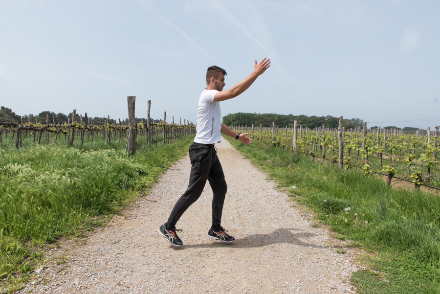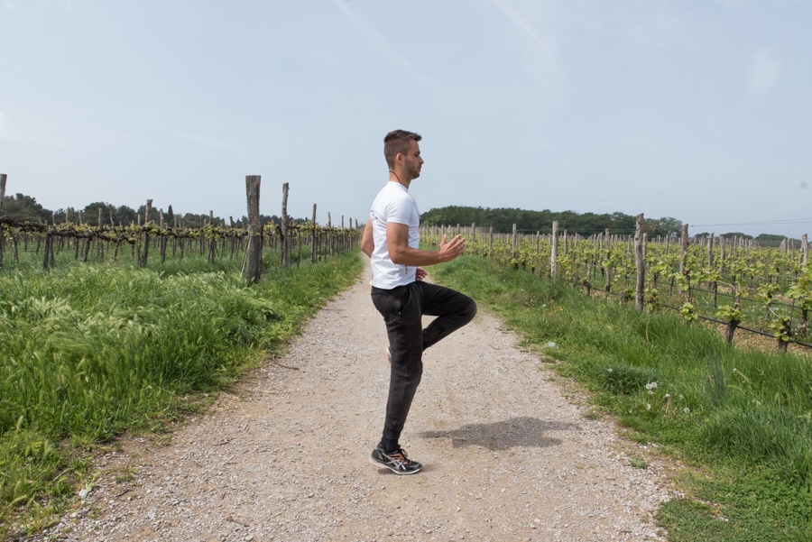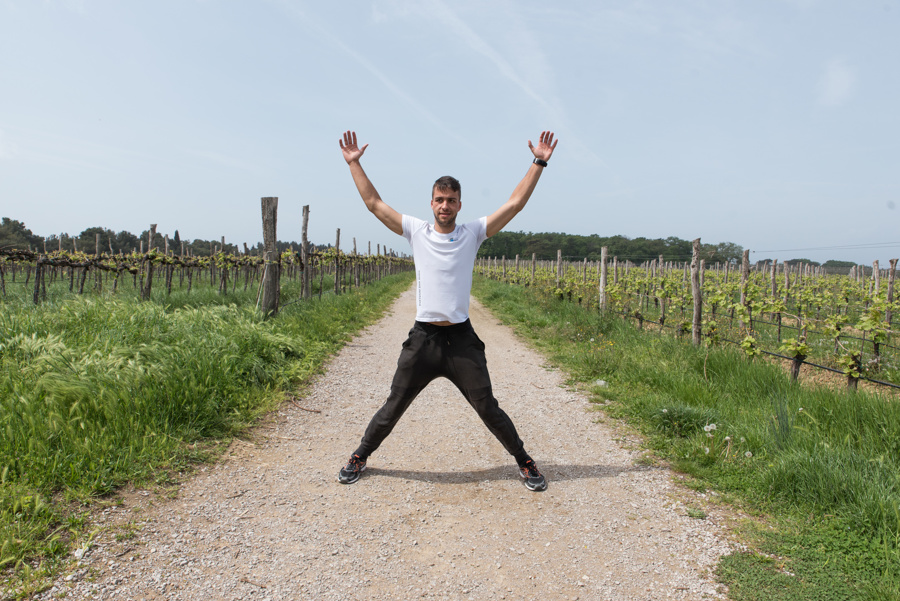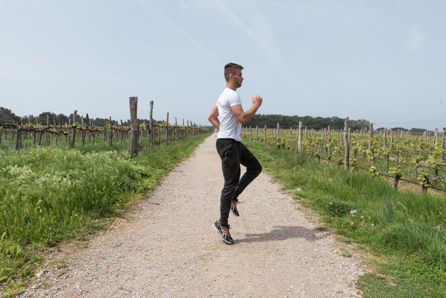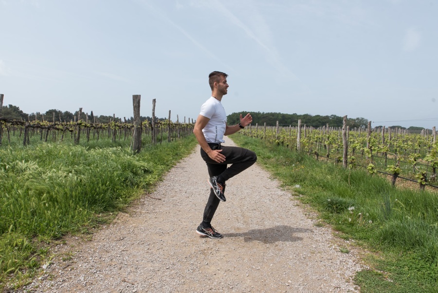 Stoje izmenično visoko zamahujemo s koleni (hopsamo). Vajo izvajamo v dveh ali treh serijah po 30 sekund.