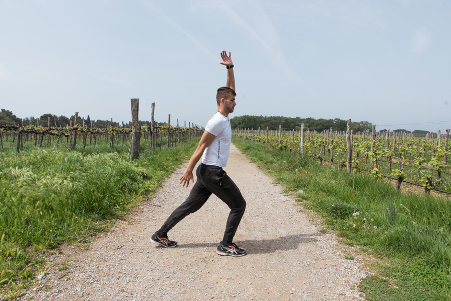 V položaju razkoraka se spustimo na eno stran, tako da sočasno upognemo kolk in koleno. Pri tem pazimo, da nasprotno nogo popolnoma iztegnemo v kolenu. V razteznem položaju zadržimo 2 do 3 sekunde ter se vrnemo nazaj v začetni položaj. Vajo ponovimo še za drugo nogo. Izvajamo jo v dveh serijah s po desetimi ponovitvami za vsako stran telesa.