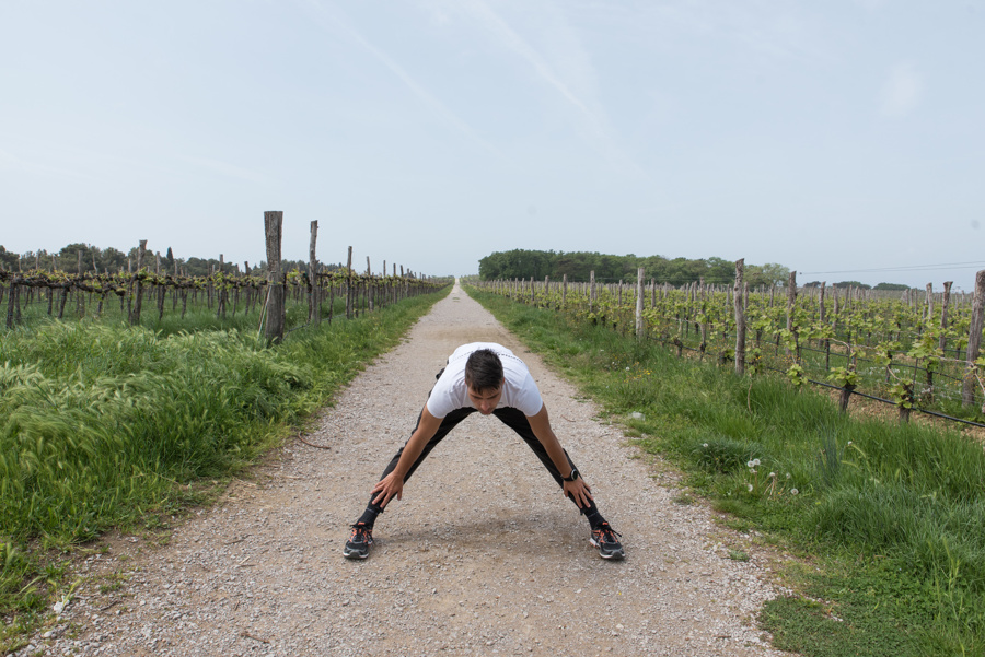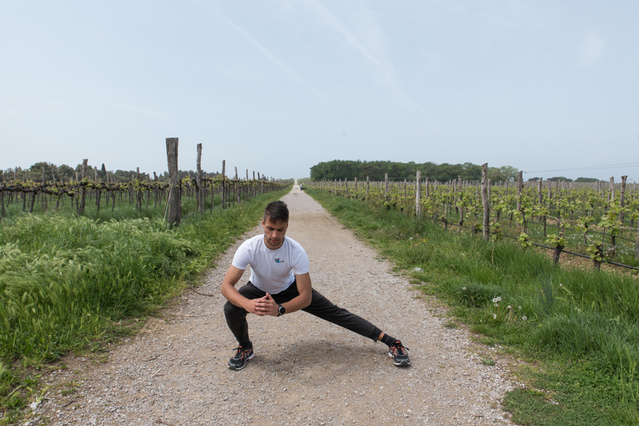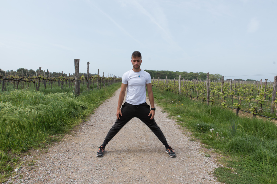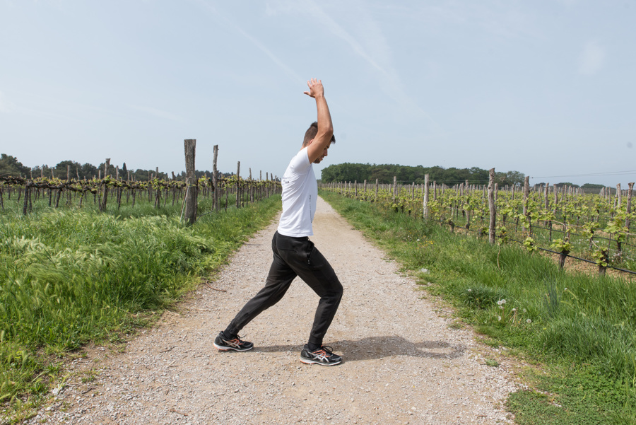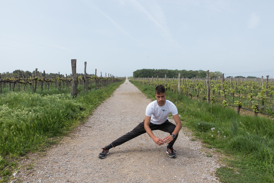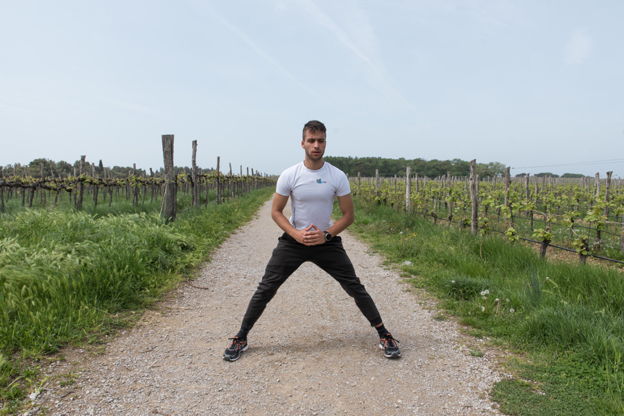 V položaju razkoraka se spustimo v predklon. Pri tem pazimo, da imamo noge v kolenu popolnoma iztegnjene. V razteznem položaju zadržimo 2 do 3 sekunde, zatem se vrnemo v začetni položaj. Vajo izvajamo v dveh serijah s po desetimi ponovitvami za vsako stran telesa.