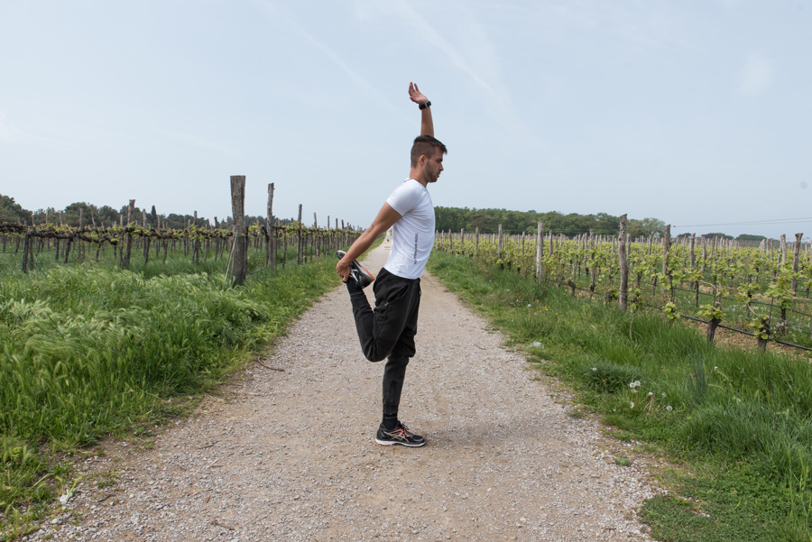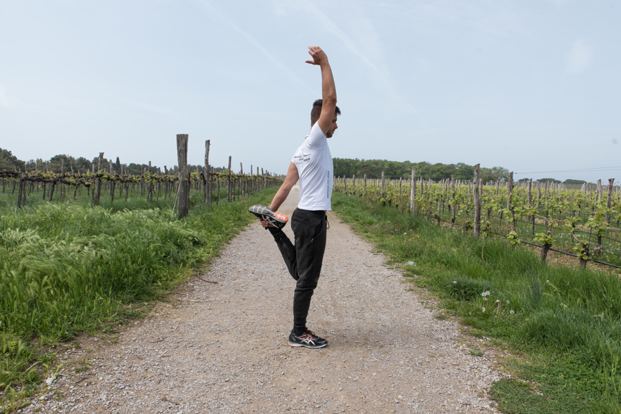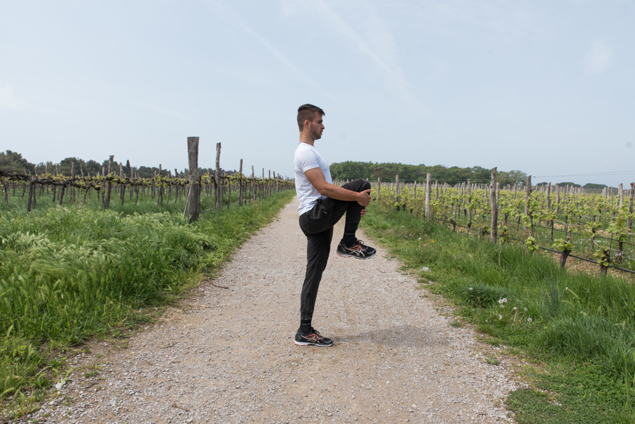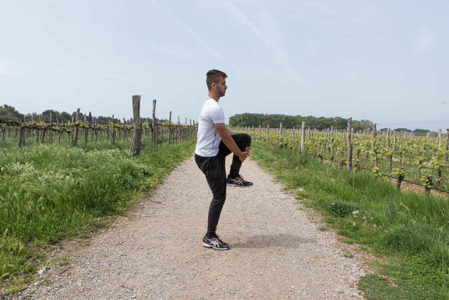 Stoje izmenično upogibamo kolena, tako da z roko poskusimo približat peto k zadnjici. V razteznem položaju zadržimo 2 do 3 sekunde in se vrnemo nazaj v začetni položaj. Vajo ponovimo še za drugo nogo. Vadimo v dveh serijah s po desetimi ponovitvami za vsako stran telesa.